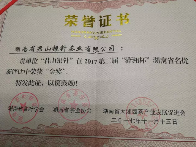 剛剛閉幕的中國(guó)茶葉科技年會(huì)表彰了第二屆“瀟湘杯”湖南名優(yōu)獎(jiǎng)獲獎(jiǎng)單位,君山茶業(yè)-君山銀針繼2016年獲得首屆"瀟湘杯"湖南名優(yōu)獎(jiǎng)金獎(jiǎng)后,再次獲得第二屆“瀟湘杯"湖南名優(yōu)茶金獎(jiǎng)。
